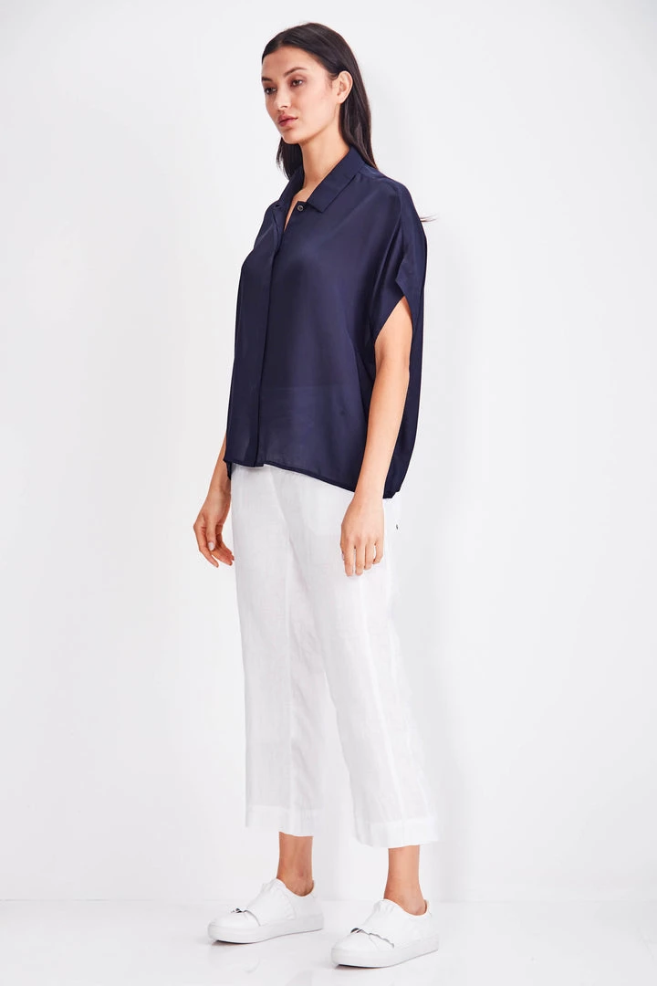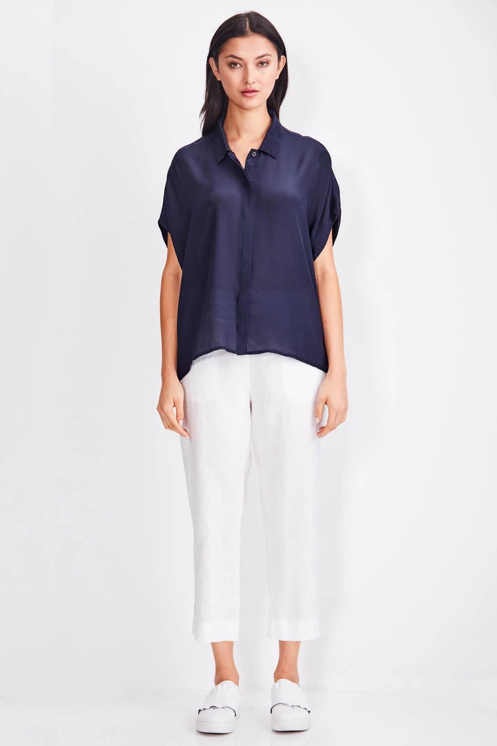 100% Silk contemporary styled shirt. The Forward shirt is collared with concealed buttons through the front and extended shoulder that creates the sleeve. The relaxed fit shirt falls to the hip.