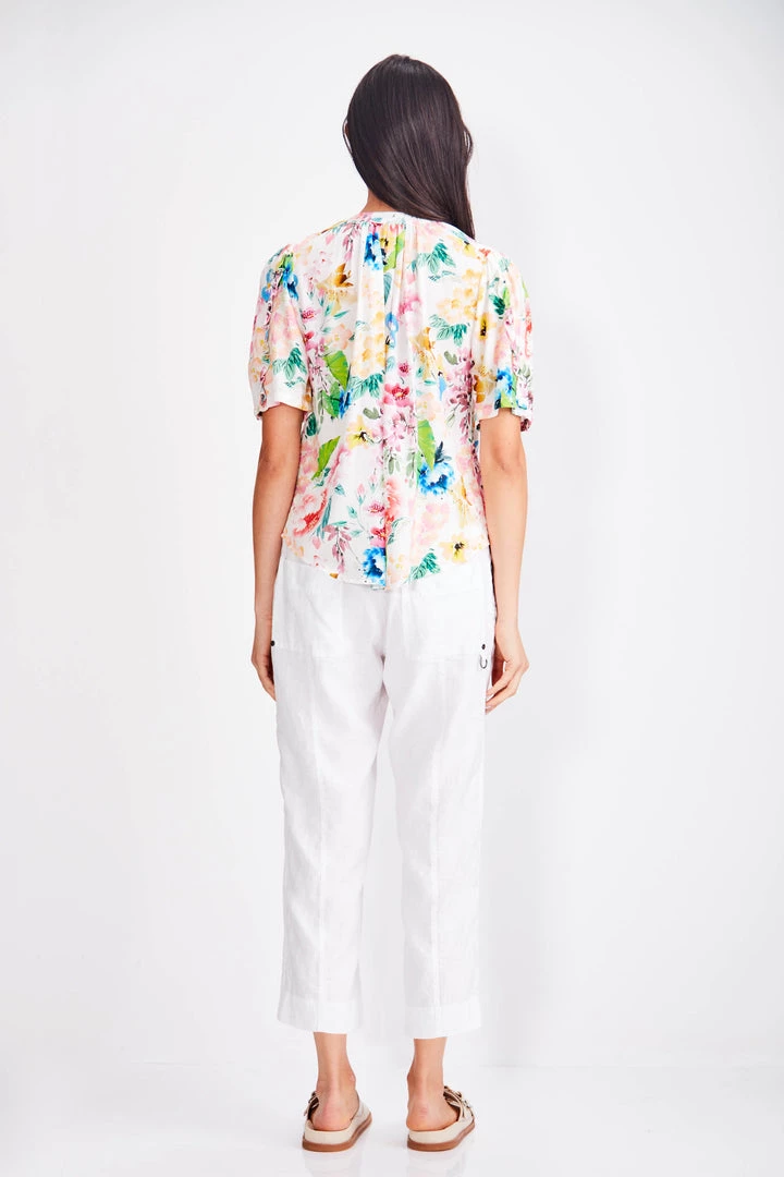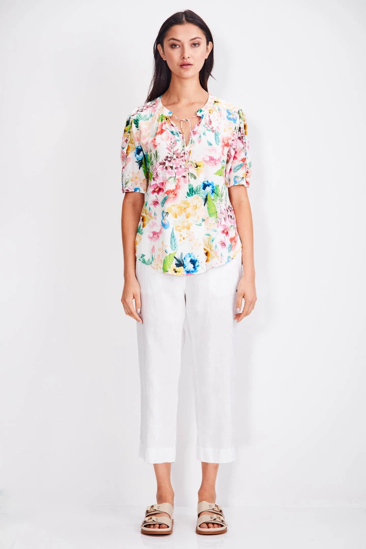 Drapey Summer floral Kyoto top. The Kyoto top features feminine frill detail on the sleeves, Nehru collar and cut away keyhole neckline with ties. The Kyoto top falls just below the hip.