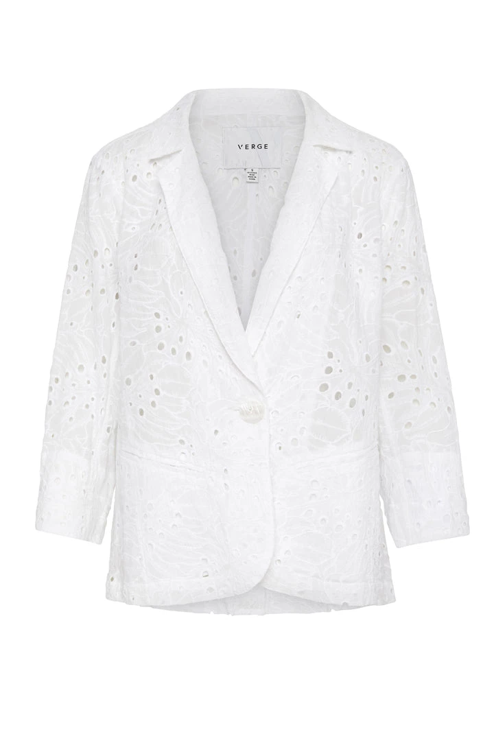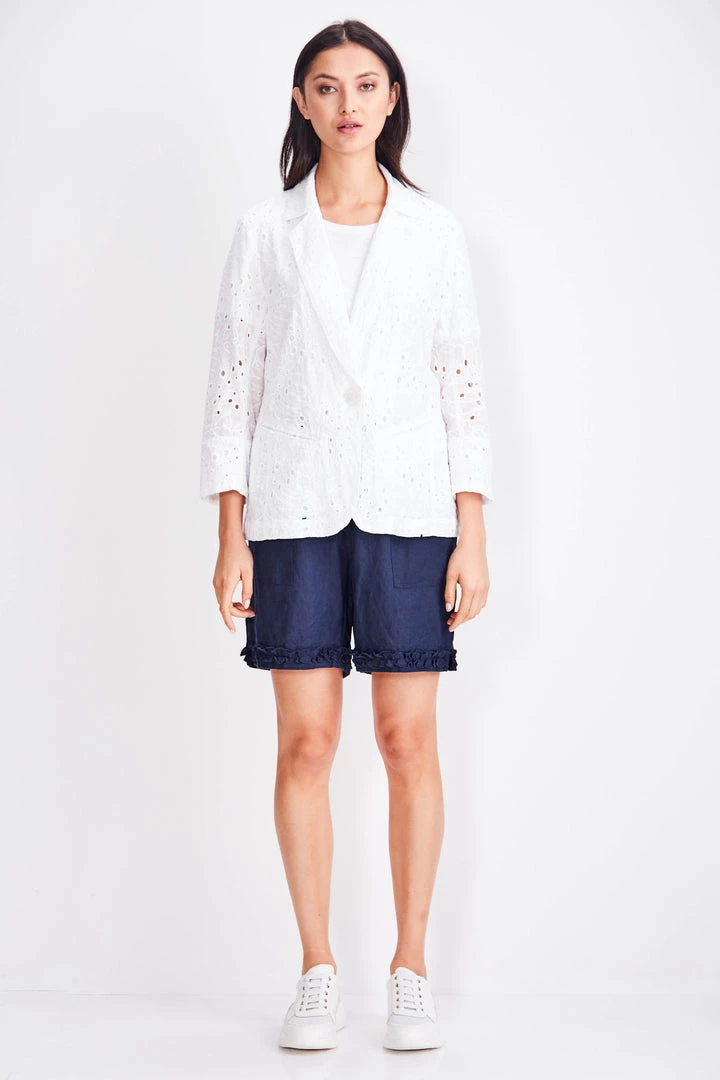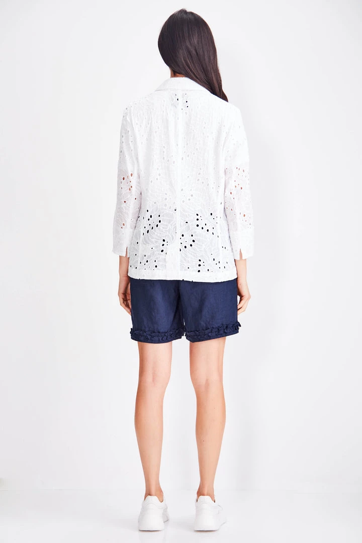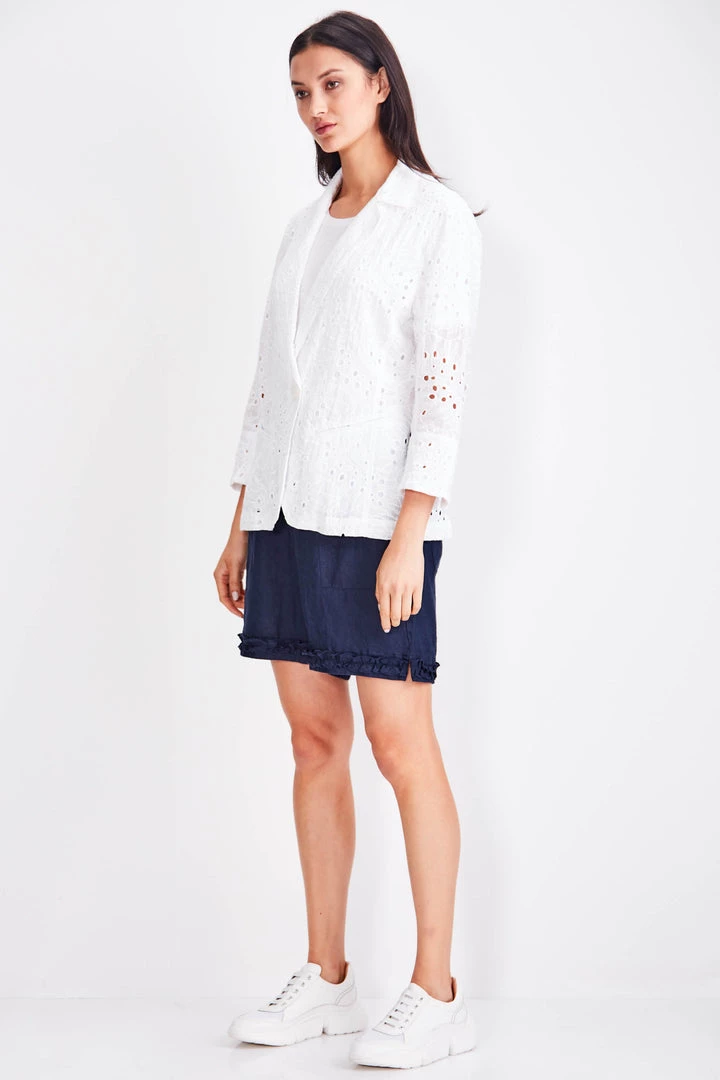 100% Cotton Embroidered Voile blazer with angled side pockets, classic front lapel and single breasted. Full length sleeves with slit at cuff to turn back if required. The Serenity Blazer falls just below the hip.