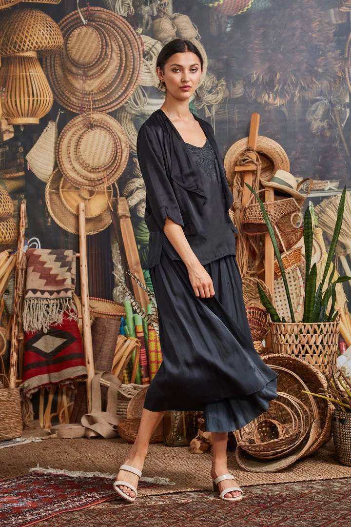 The Verge Senate Jacket in luxe liquid satin is a classic and trans-seasonal addition to any outfit. Featuring a waterfall front, half length sleeves and a cropped shape, it is perfect to layer up with other liquid satin styles for a dressy outfit or to use as a lightweight cover-up for any occasion.