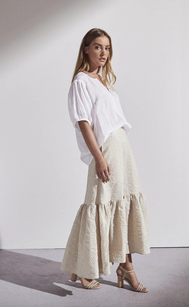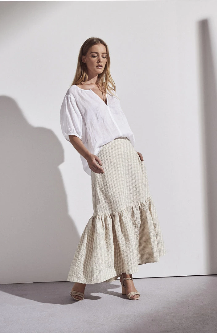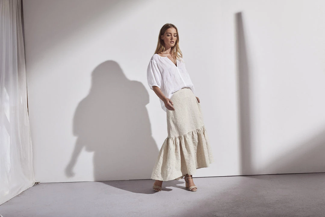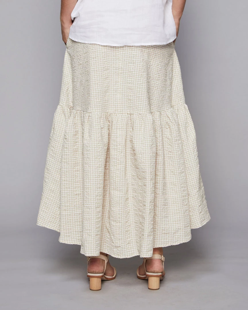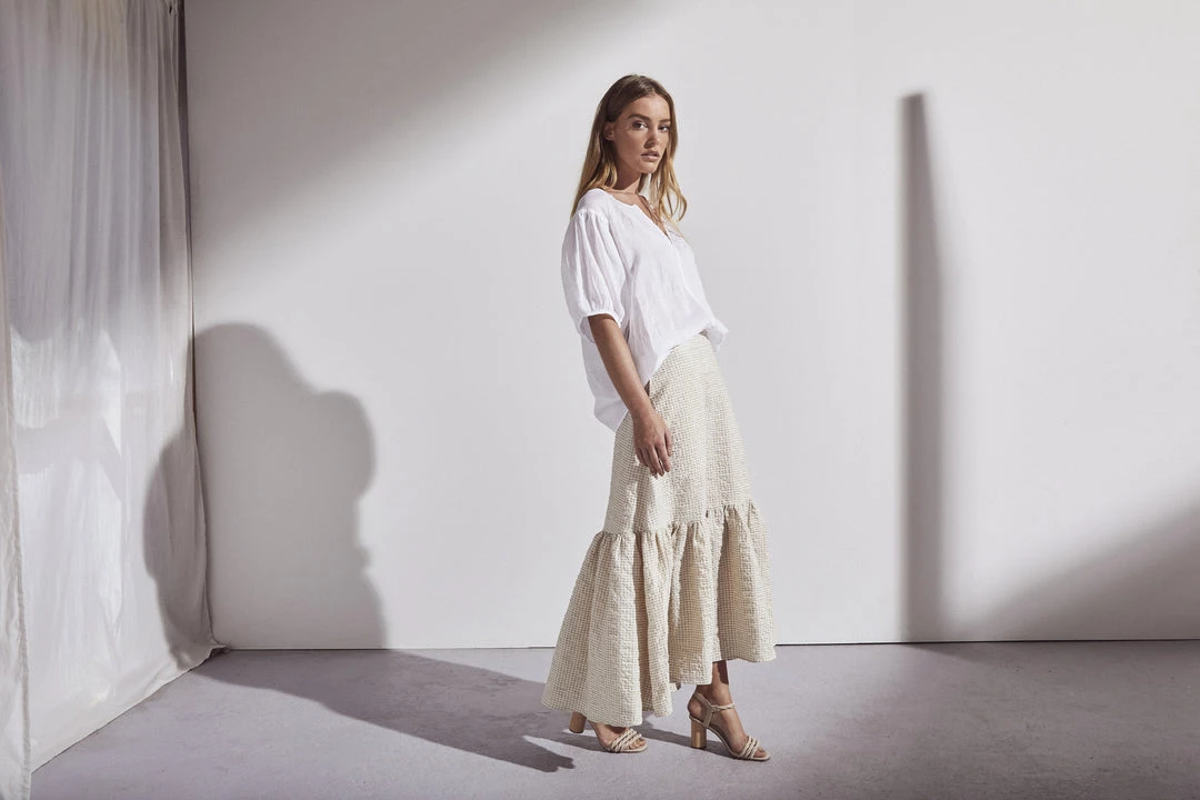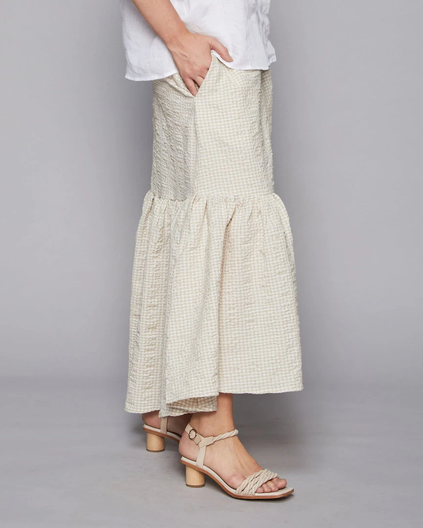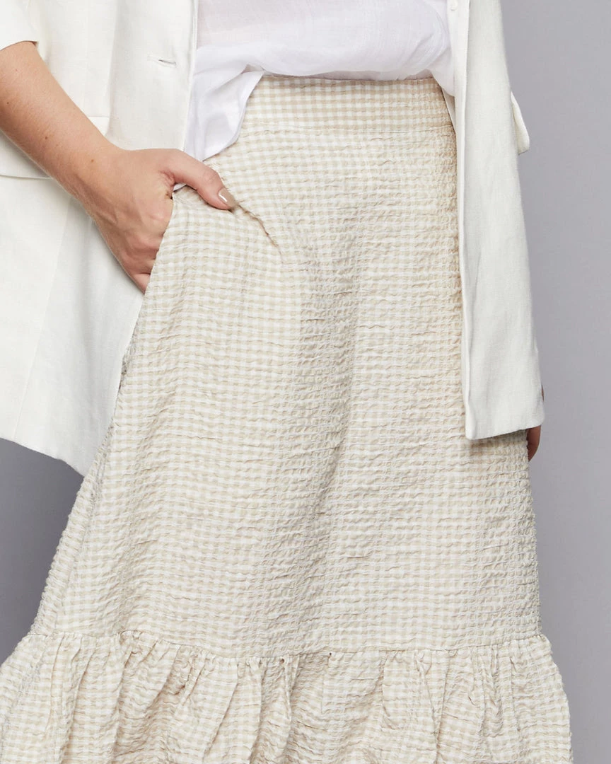 The parade skirt by Zoe Kratzmann captures the optimism of spring with its fresh crinkle-check fabric and gathered drop hem. a waistband and rear zipper ensure a neat fit through this region. wear yours with a t-shirt and sneakers for off-duty ease or team with the circa top for an effortless elevated aesthetic.